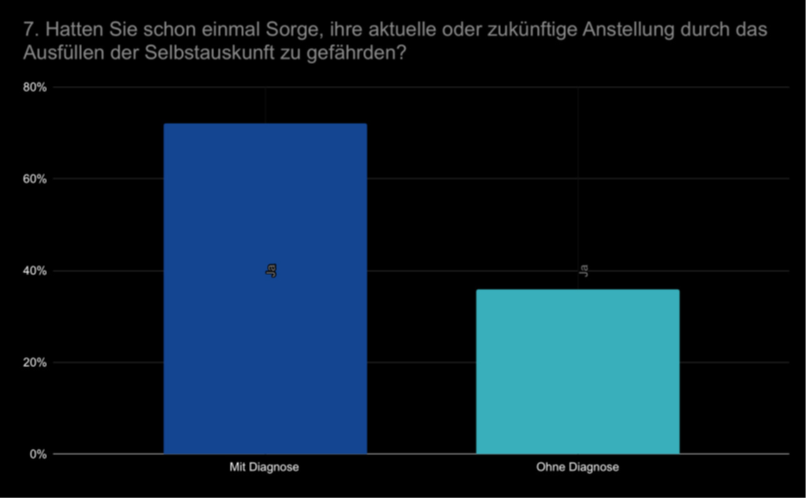 2. Ängste und Sorgen: Drei von vier Befragten haben Bedenken und Ängste, die Selbstauskunft auszufüllen. Diese Ängste und Befürchtungen sind bei Menschen mit Behinderungen, chronischen Krankheiten oder anderen Diagnosen noch deutlich stärker ausgeprägt. Sie sind wesentlich mehr besorgt, dass die Informationen von ihren Arbeitgeber:innen eingesehen werden könnten (85 % gegenüber 69 %), und ihre Befürchtung, dass dies ihren derzeitigen oder künftigen Arbeitsplatz gefährden könnte, ist doppelt so groß (72 % gegenüber 36 %).