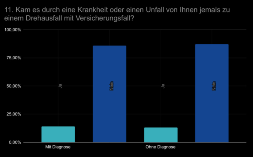 Die Umfrageergebnisse bieten einen fundierten Einblick in die Personenaus- fallversicherung in der Film- und Fernsehproduktion. Sie zeigen die Ablehnung der Praxis durch die Mehrheit der Befragten und die Gleichheit in der Ausfall- häufigkeit zwischen Menschen mit und ohne Diagnosen.