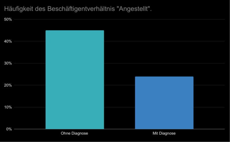 4. Beschäftigungsverhältnis: Die Häufigkeit einer festen Anstellung war bei unseren Befragten fast doppelt so hoch, wenn sie keine Behinderung, chronische Krankheit oder eine andere Diagnose hatten (45 % gegenüber 24 %).