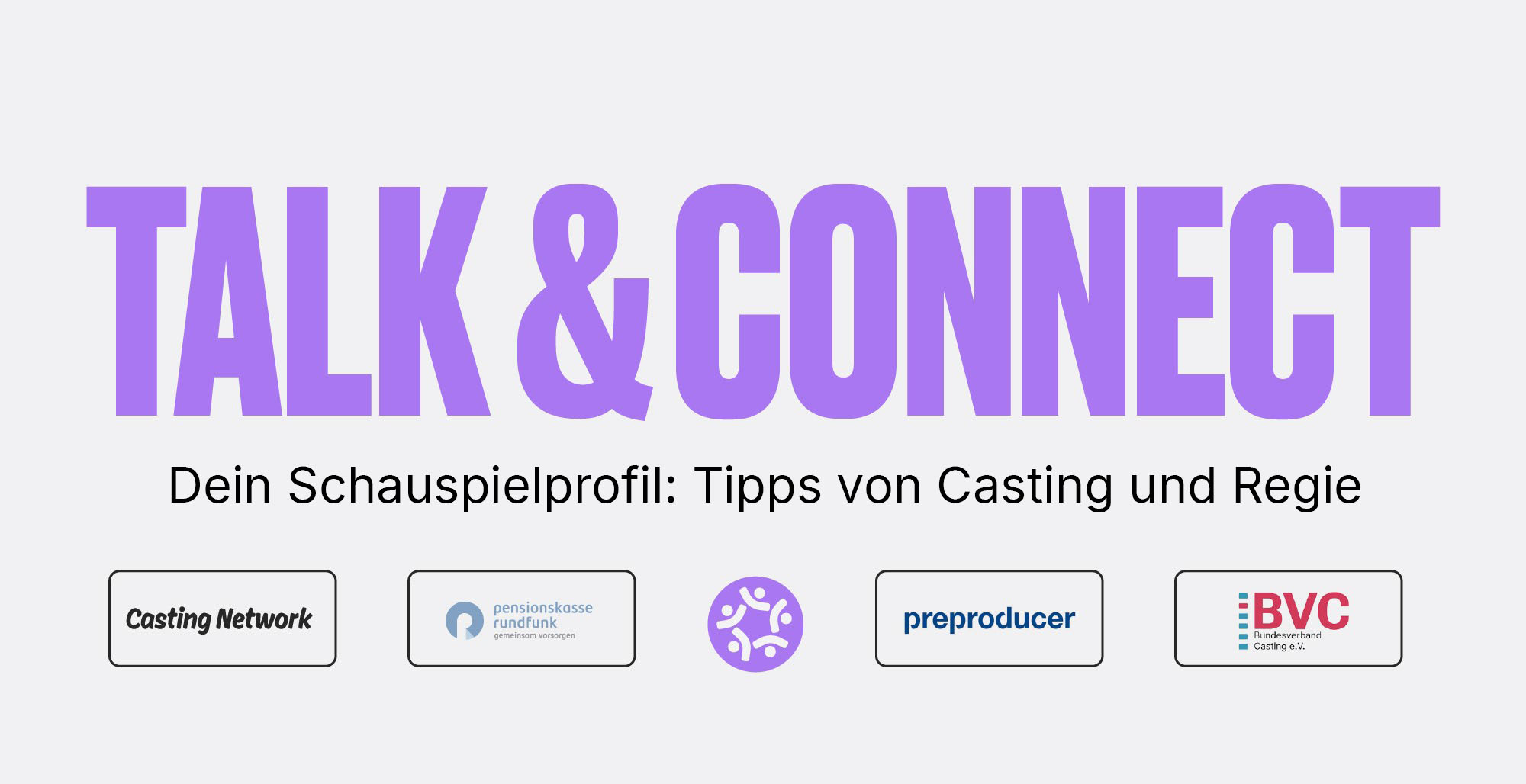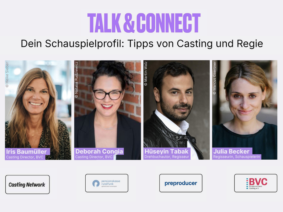 Talk & Connect: Die Webinar-Reihe wurde im Sommer 2024 von Casting Network in Kooperation mit der Pensionskasse Rundfunk, Preproducer und verschiedenen Fachverbänden der Film- und Fernsehbranche entwickelt und auch durchgeführt. Bisherige Talk & Connect Webinare findet Ihr hier.