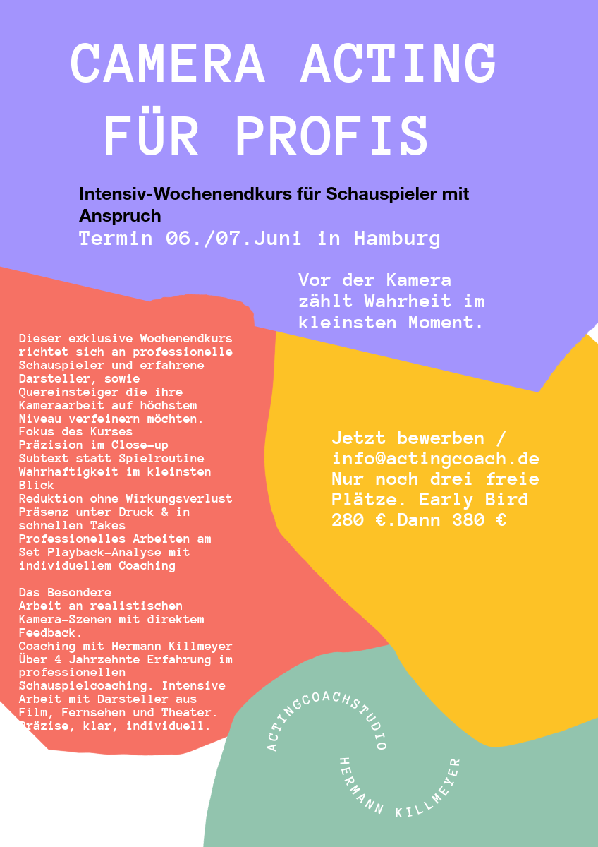 Unser Camera Acting & Casting Special ist ein intensives Wochenend-Training für Schauspieler, die ihre Präsenz vor der Kamera stärken und professionell in Casting-Situationen agieren möchten.
